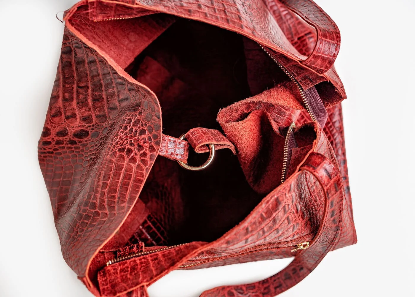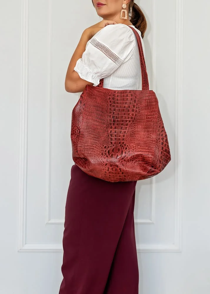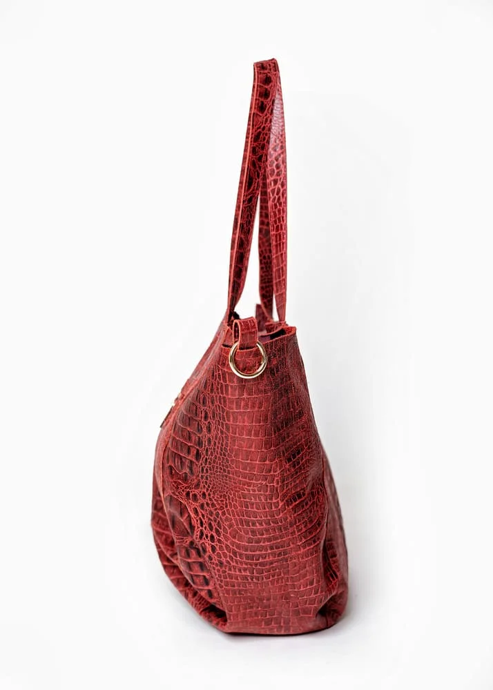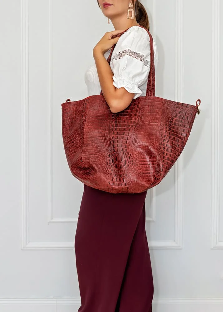 Torebka Allure została stworzona z myślą o kobietach, które cenią sobie nie tylko styl, ale także trwałość. Wykonana z prawdziwej skóry o tłoczeniu na wzór krokodyla, przyciąga wzrok eleganckim, bordowym odcieniem. Skóra krokodyla to symbol luksusu i wyrafinowania, dzięki czemu torebka Allure doskonale wpisuje się w najnowsze trendy mody.