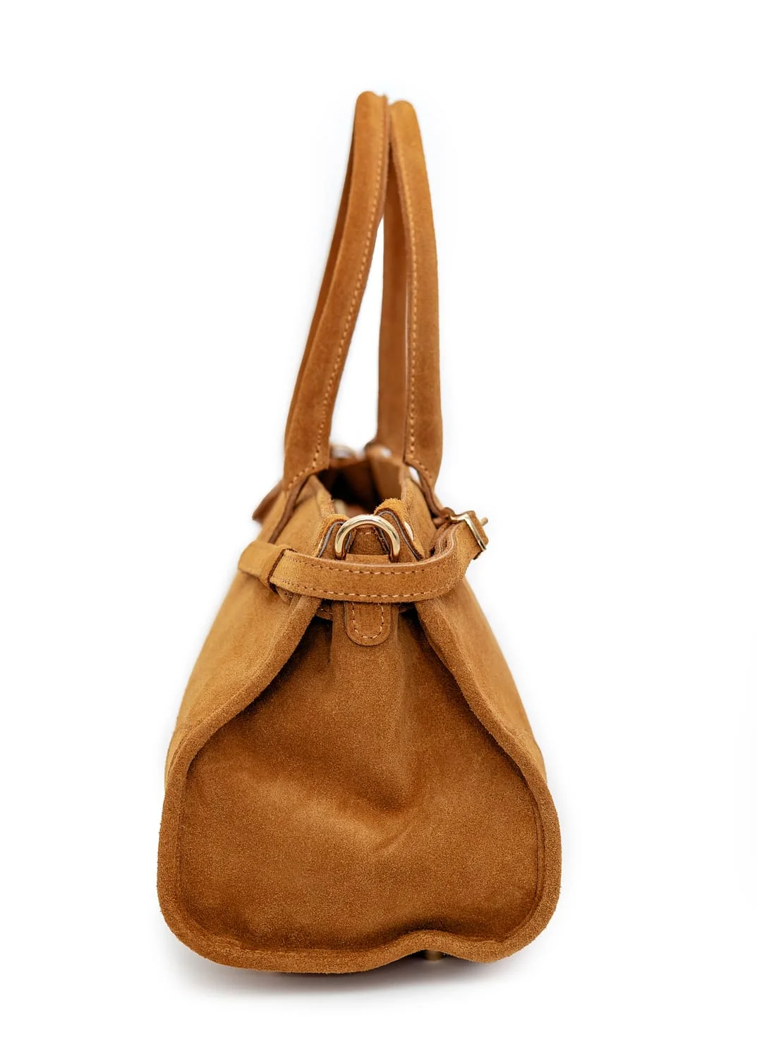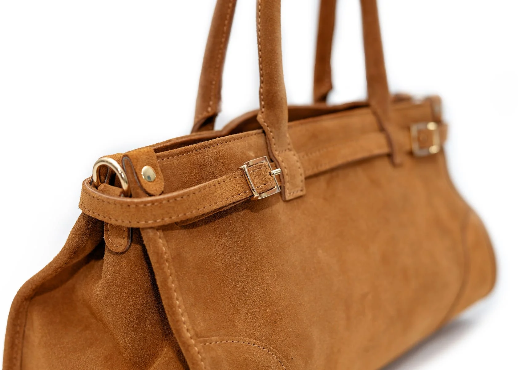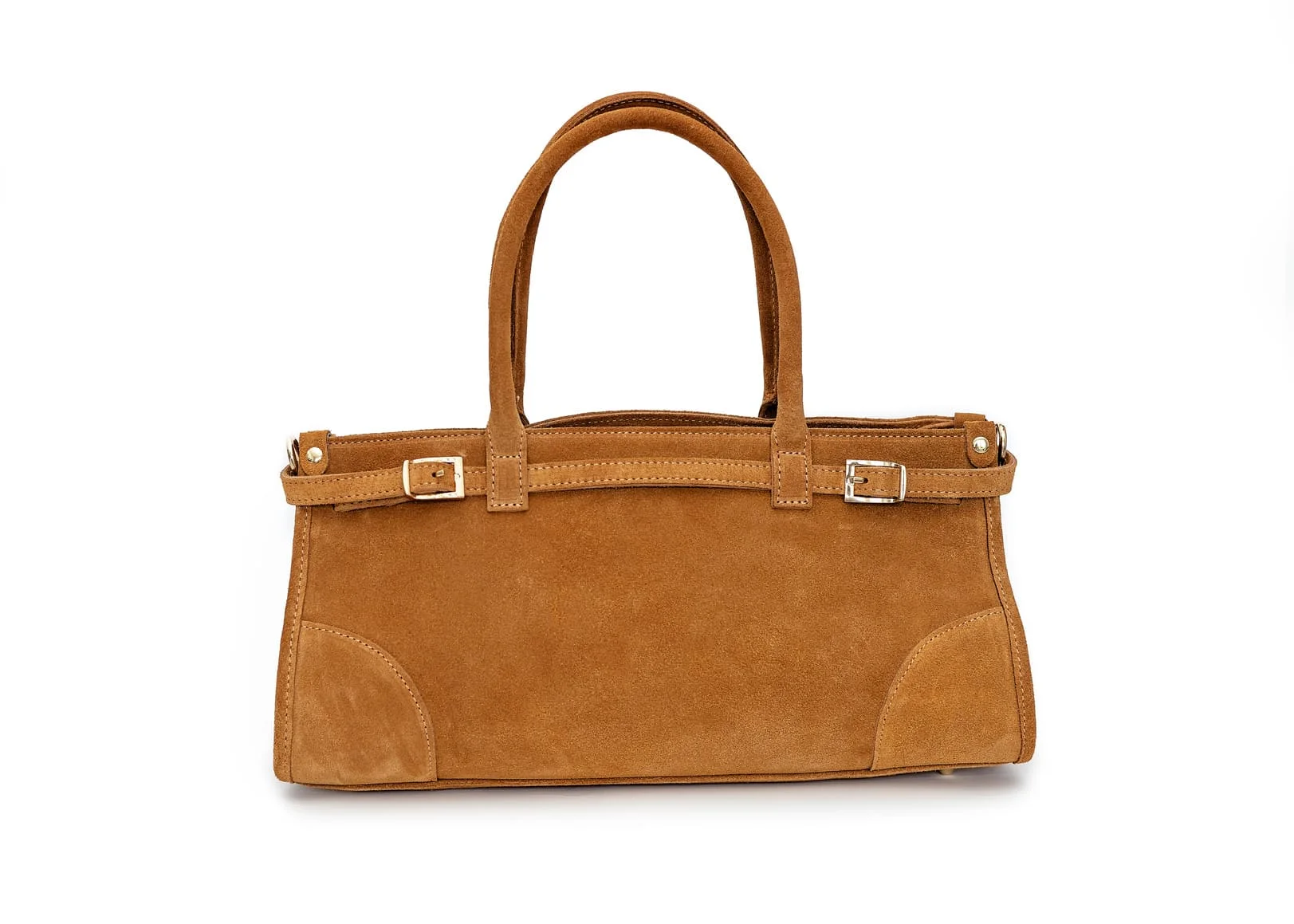 Poznaj elegancką torebkę Pravia wykonaną z najwyższej jakości naturalnej skóry zamszowej w kolorze karmelowym. Dostępna również w kolorze beżowym 👜