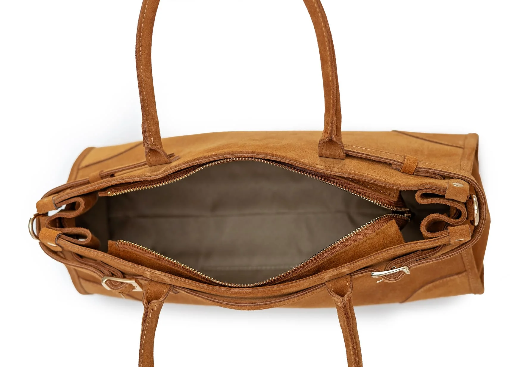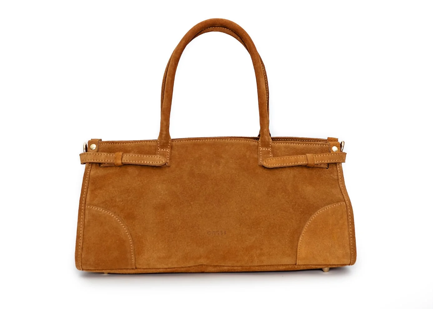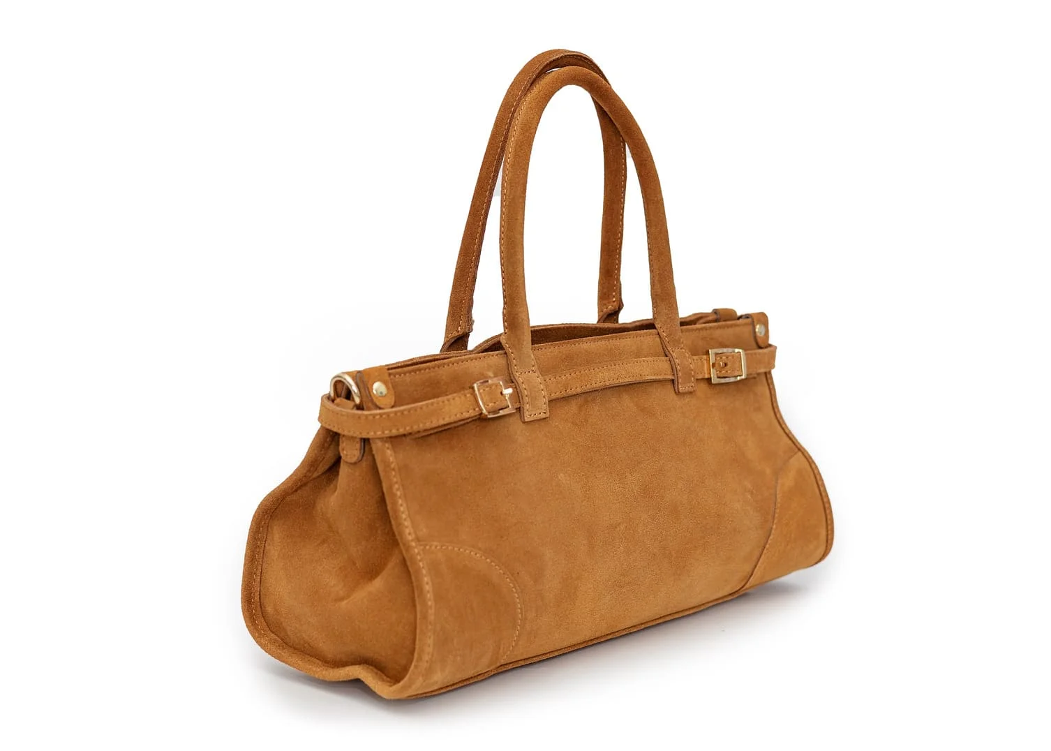 Poznaj elegancką torebkę Pravia wykonaną z najwyższej jakości naturalnej skóry zamszowej w kolorze karmelowym. Dostępna również w kolorze beżowym 👜