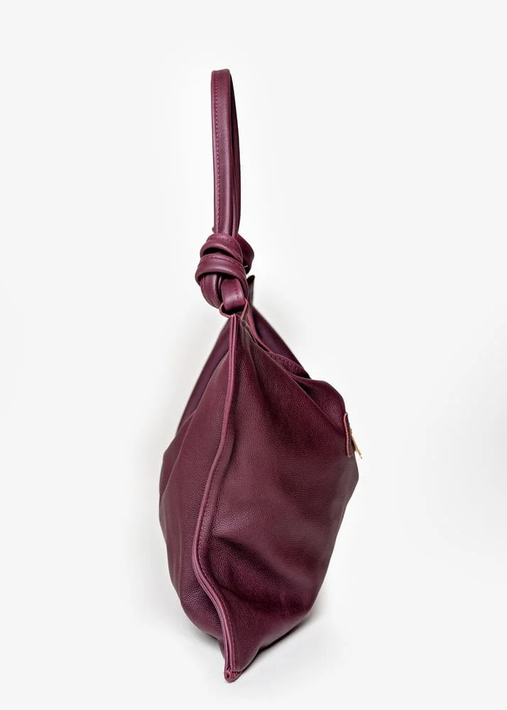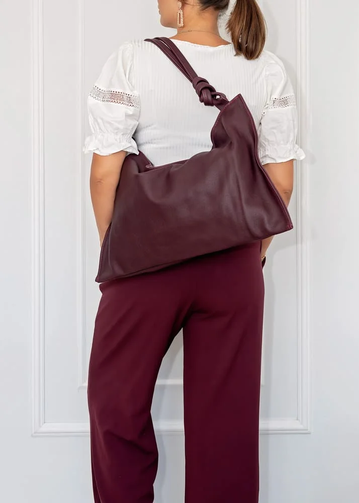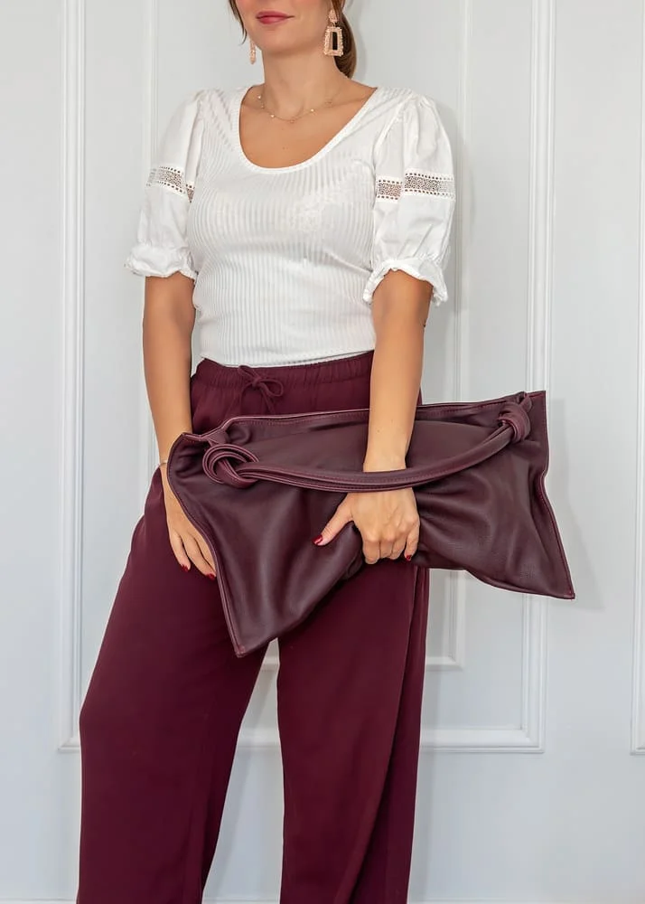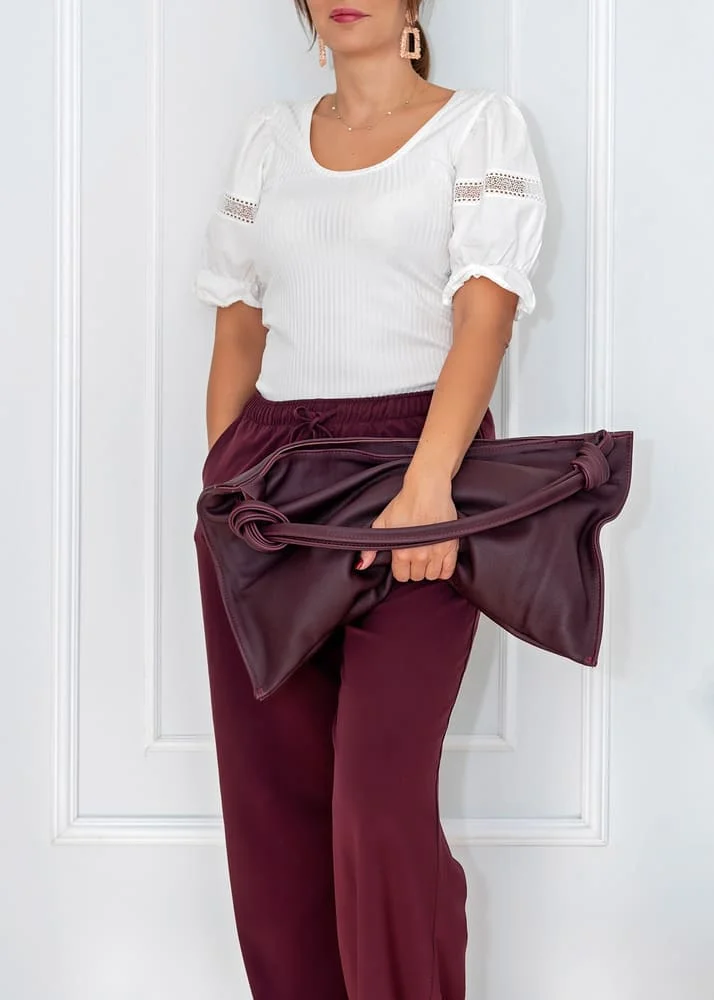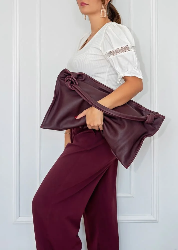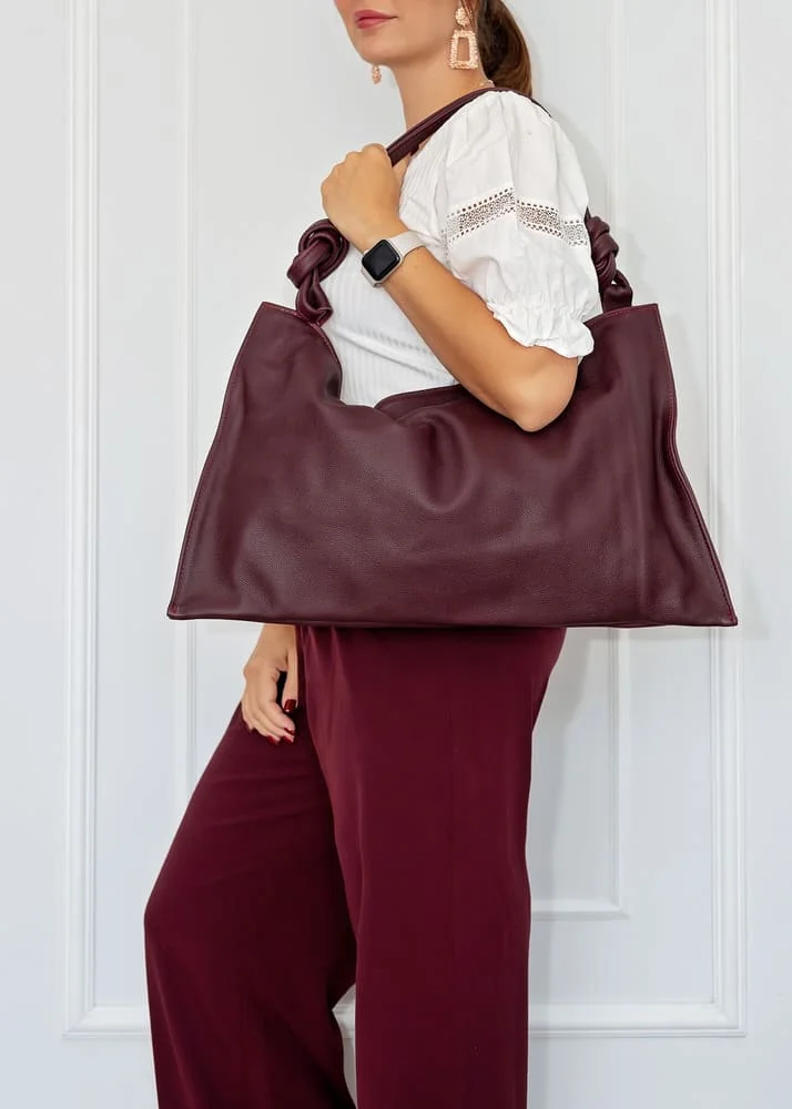 Charakterystyczne węzły na uchwytach to detal, który odróżnia torebkę Botella od innych modeli. To oryginalny akcent dodający nuty nonszalancji oraz podkreślający indywidualny charakter torebki. Złote elementy, w tym zamek, wspaniale kontrastują z bordowym odcieniem, tworząc elegancki i wyrafinowany wygląd.