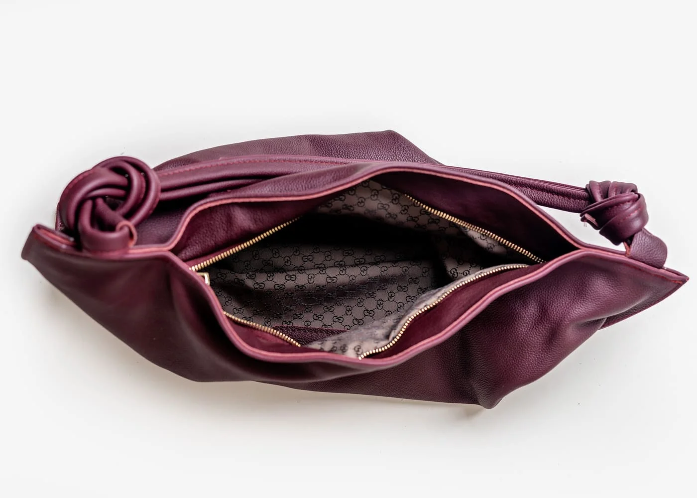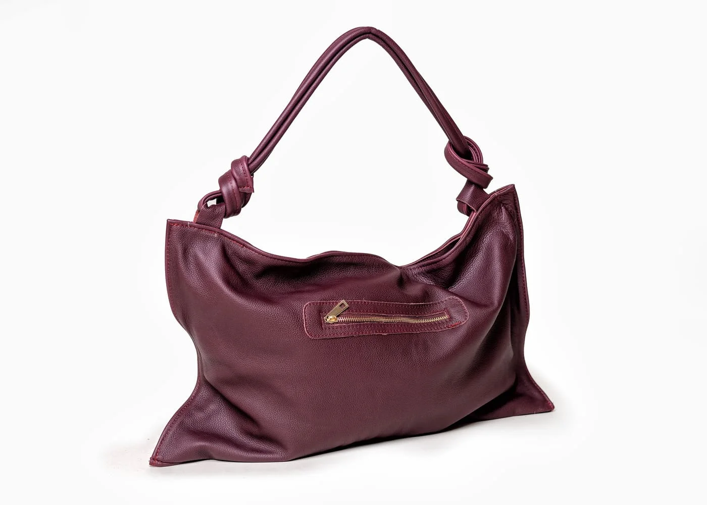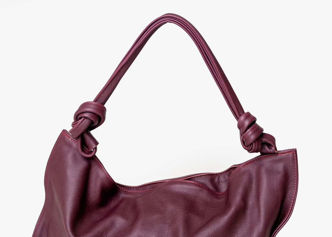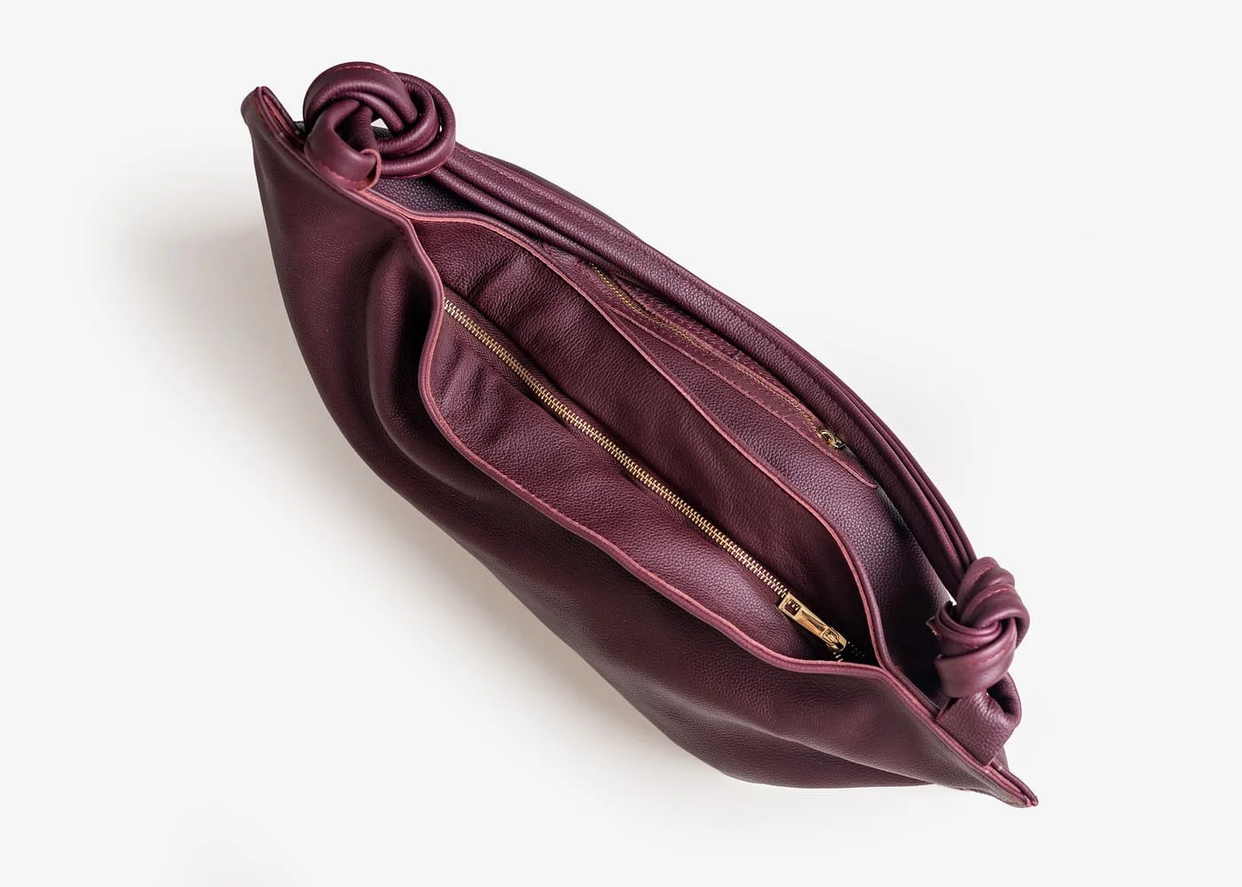Charakterystyczne węzły na uchwytach to detal, który odróżnia torebkę Botella od innych modeli. To oryginalny akcent dodający nuty nonszalancji oraz podkreślający indywidualny charakter torebki. Złote elementy, w tym zamek, wspaniale kontrastują z bordowym odcieniem, tworząc elegancki i wyrafinowany wygląd.