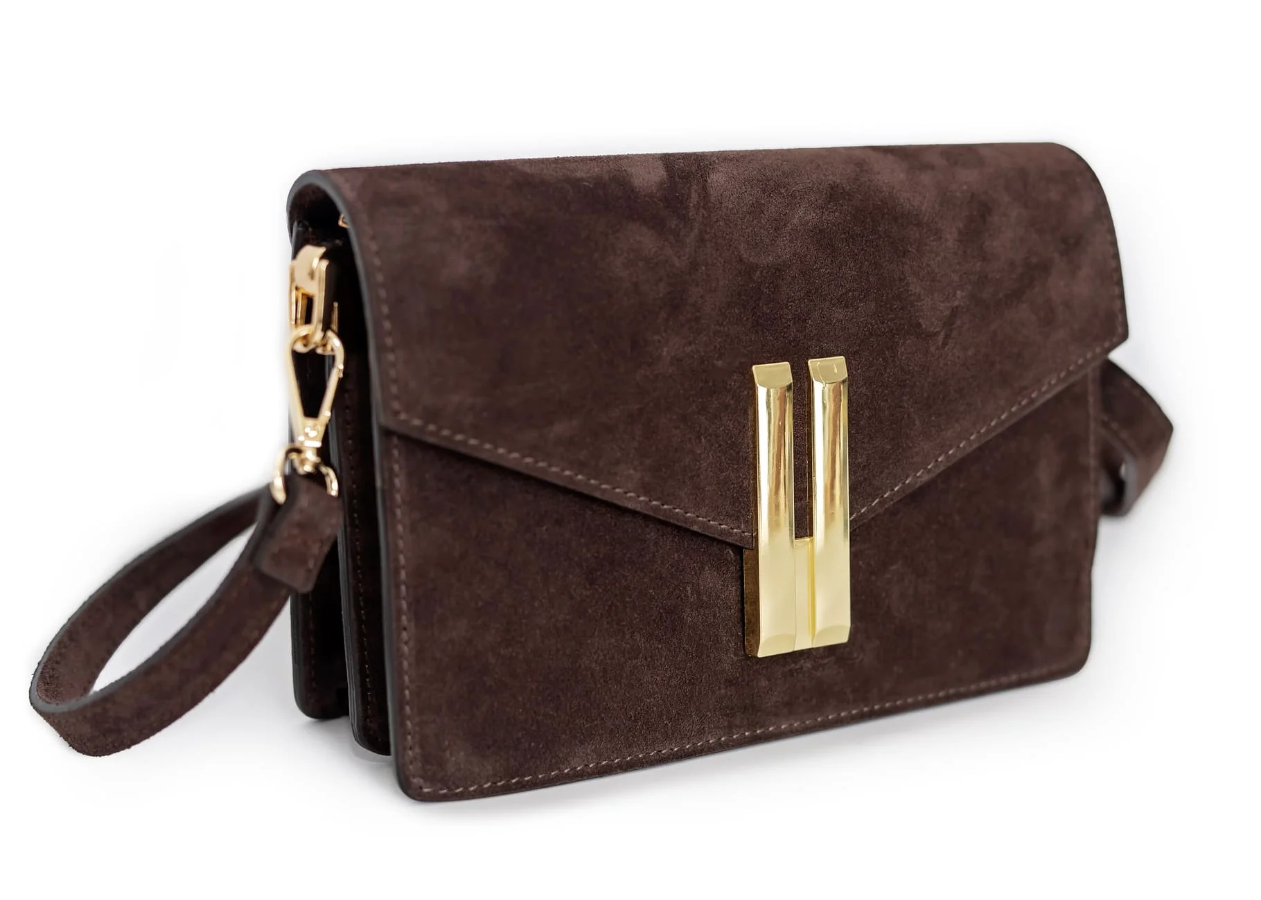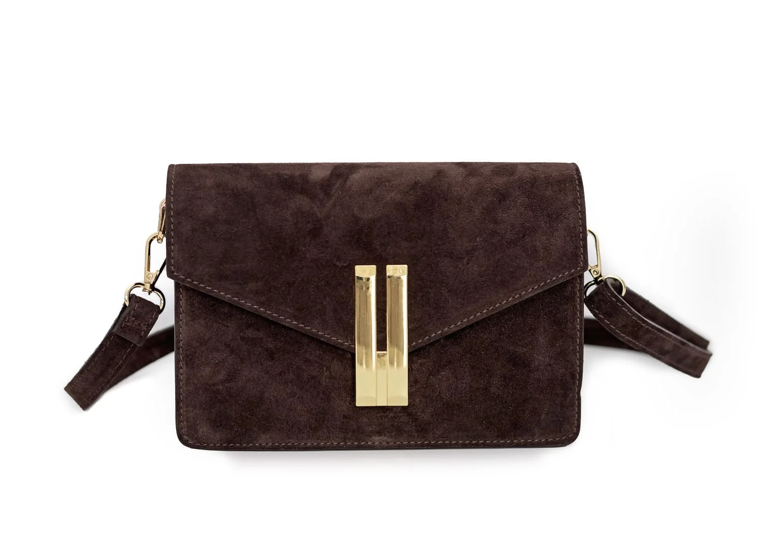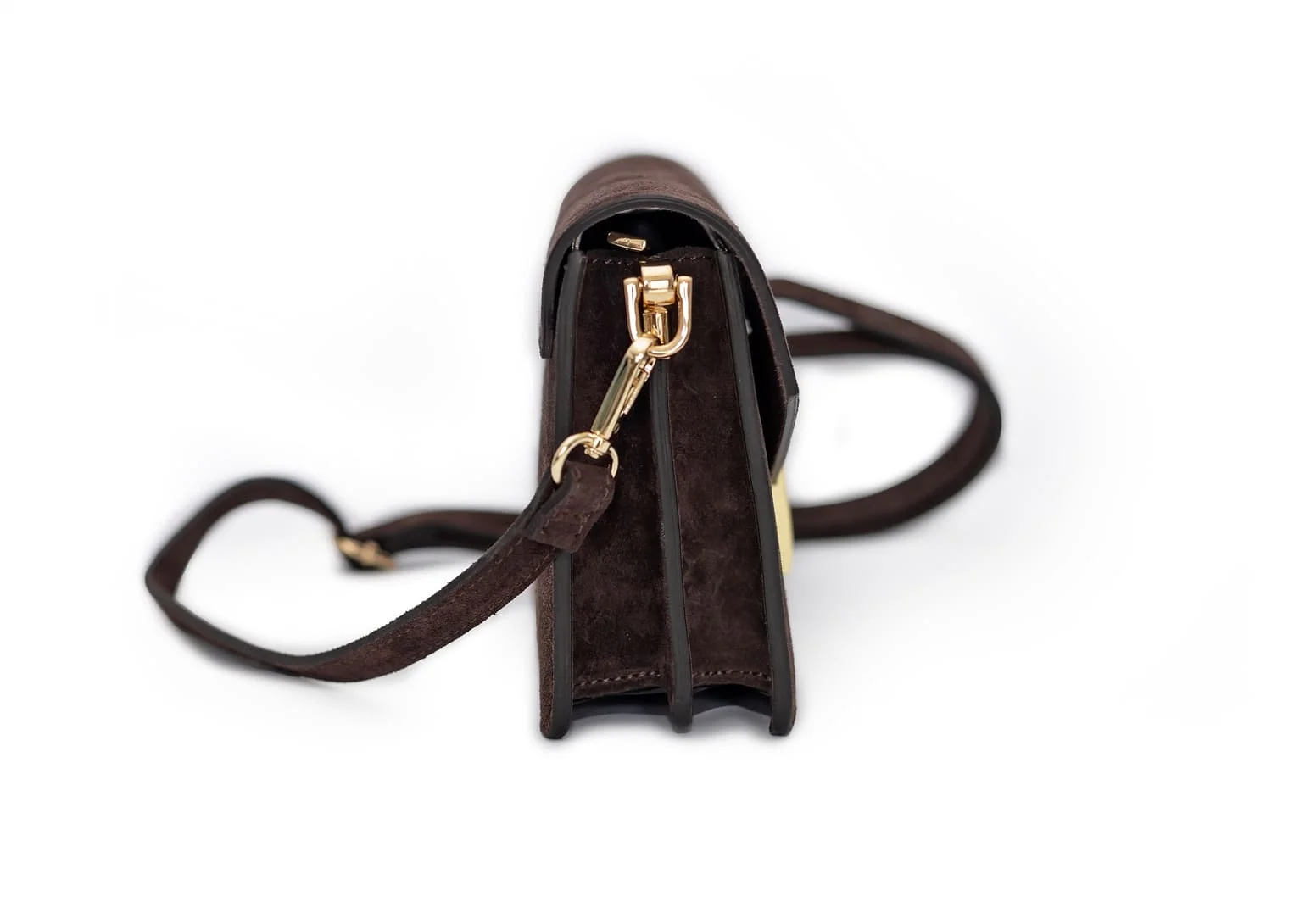 Vivienne Midi to kompaktowa listonoszka o wyrazistym charakterze. Głęboki, czekoladowy brąz zamszu podkreślają biżuteryjne, złote „podwójne” zapięcie i równe, dopracowane przeszycia.