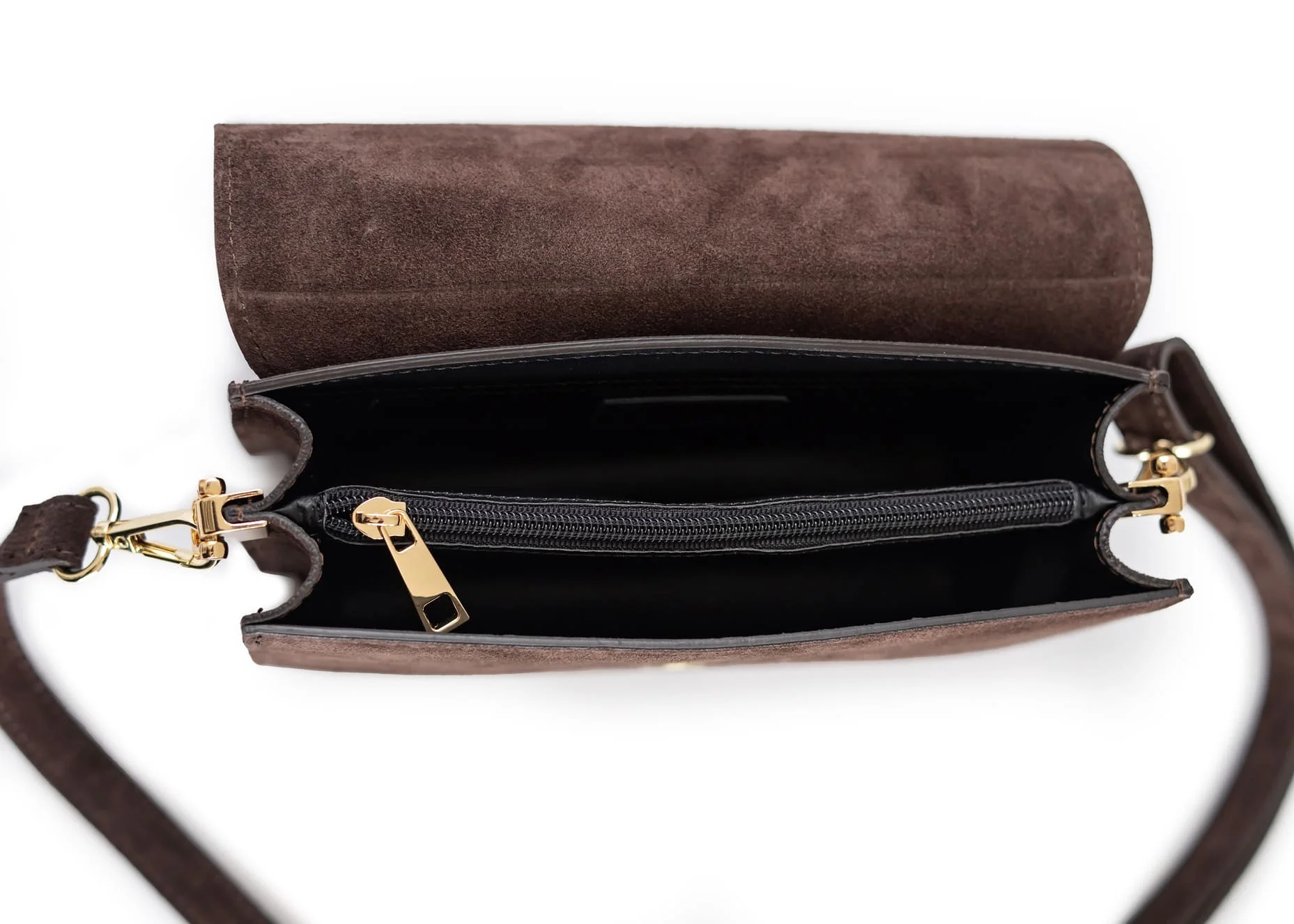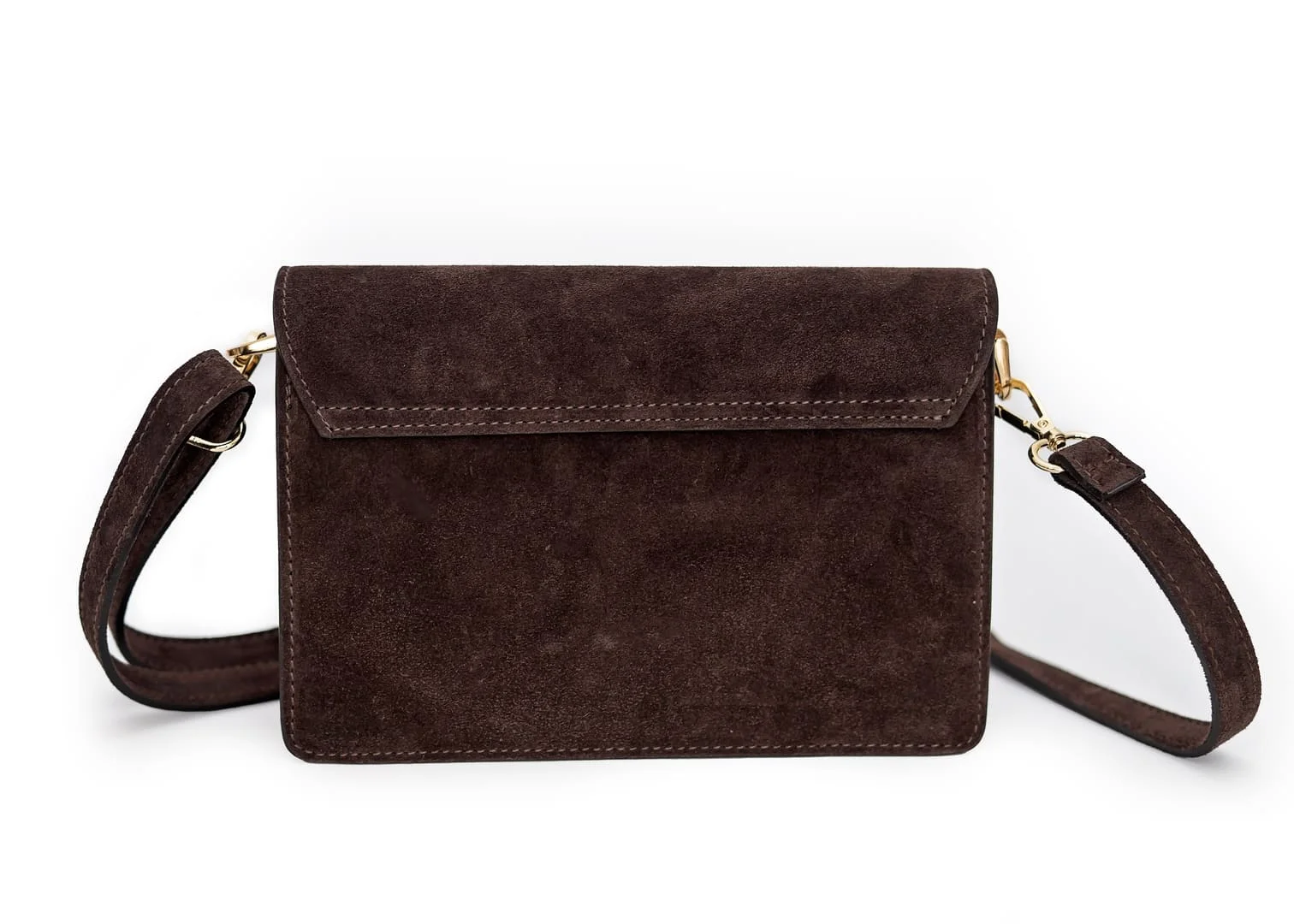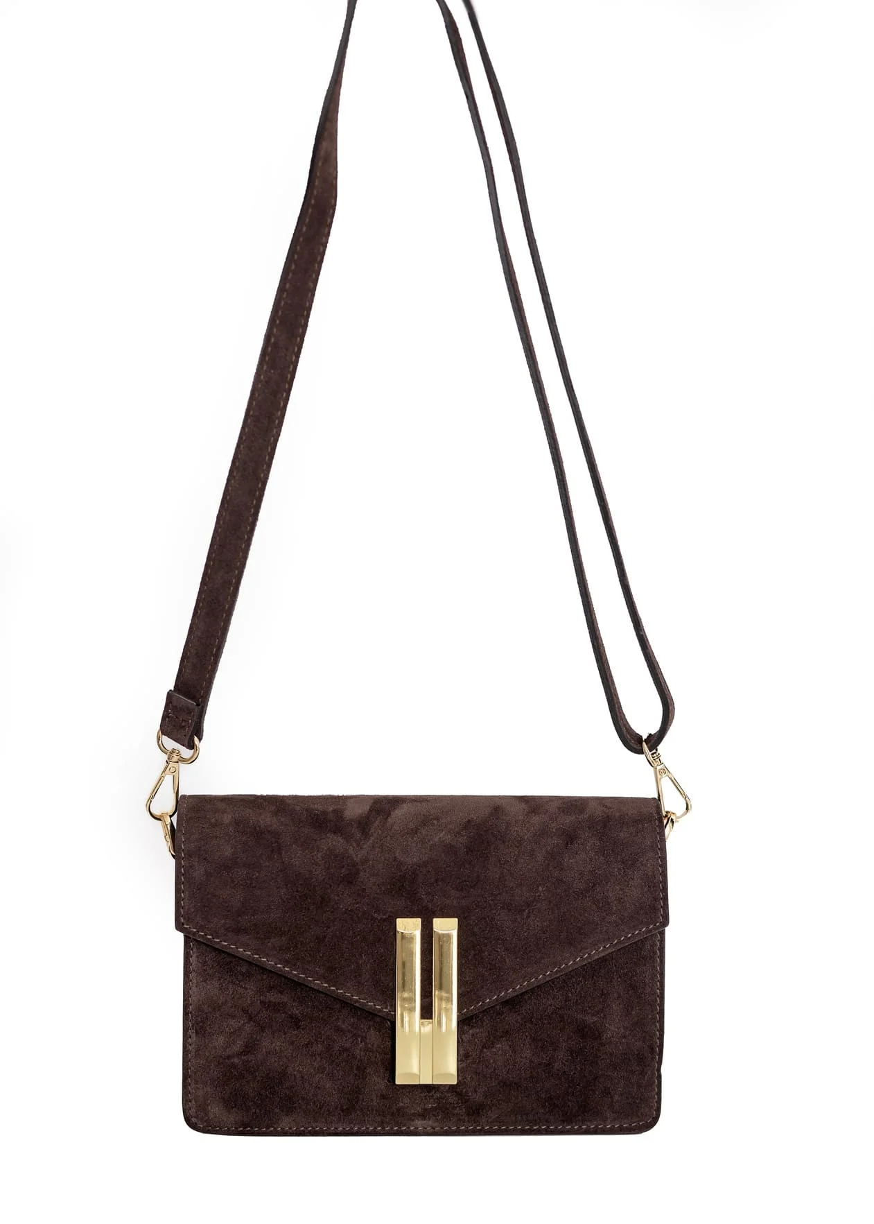 Vivienne Midi to kompaktowa listonoszka o wyrazistym charakterze. Głęboki, czekoladowy brąz zamszu podkreślają biżuteryjne, złote „podwójne” zapięcie i równe, dopracowane przeszycia.